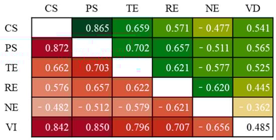 The latent variable scores were calculated based on PLS using the observed variables. Figure 5 shows the Pearson correlation coefficients of latent variables in Model 1 (red squares) and Model 2 (green squares). The darker the color, the stronger the correlation. The results indicate that the correlation coefficients between variables are within the range of [−0.362, 0.872], suggesting a strong correlation between the latent variables, with the correlation in Model 1 being slightly higher than that of the same group of variables in Model 2.