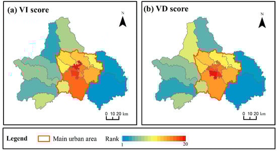 VI and VD scores of districts. (a) VI score; (b) VD score.