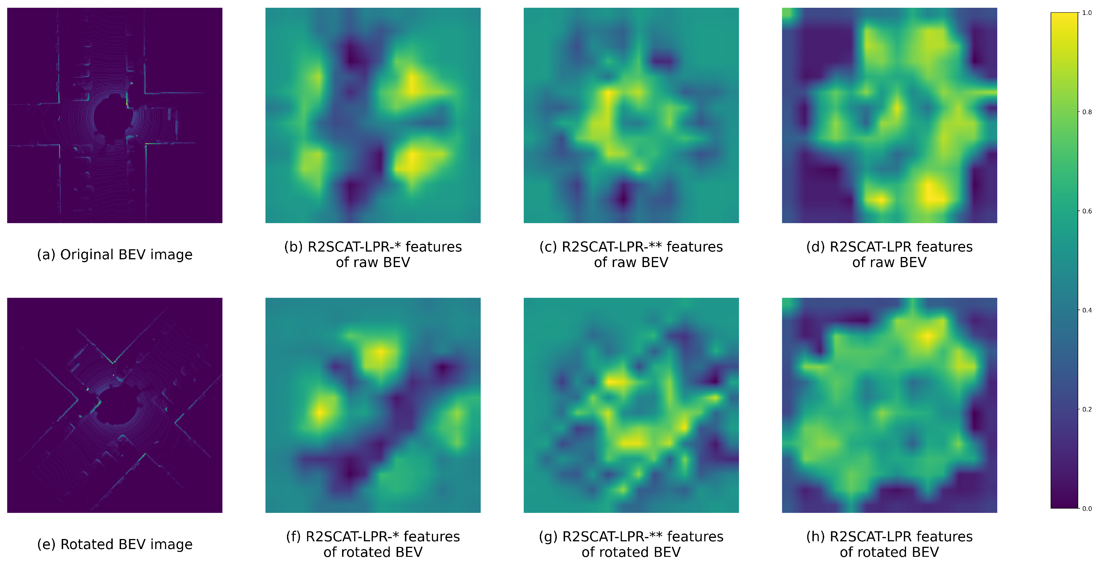 Additionally, the feature map comparisons show that R2SCAT-LPR places more emphasis on semantically rich regions of the scene (e.g., road edges, vehicles), thereby minimizing interference from background information. Combined with the quantitative metrics in
