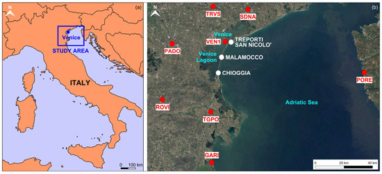 Location of the study area (a); the eight CGNSS stations of the external GNSS network—TRVS (Treviso), SDNA (San Donà), VEN1 (Venezia), PADO (Padova), PORE (Porec), ROVI (Rovigo), TGPO (Taglio di Po), and GARI (Porto Garibaldi)—along with the four inlets of Treporti, San Nicolò, Malamocco, and Chioggia (b).