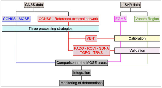 The aim of this study is to integrate GNSS and InSAR techniques by calibrating InSAR data using ground-based GNSS information and validating it with independent stations to develop an effective monitoring system for the emerged structures and surrounding area. CGNSS observations were obtained from: (i) 32 continuous stations located near the corners of the building structures in the inlets of Treporti, San Nicolò, Malamocco, and Chioggia; (ii) four continuous stations located near the shoulder structures, serving as reference points for each barrier; (iii) eight continuous stations used to define the external reference network and co-register the data in the ETRF2014 reference system. InSAR data were collected from: (i) the European ground motion service (EGMS) of the Copernicus program; and (ii) the Veneto Region database. Continuous GNSS observations were processed using Bernese software, obtaining 3D velocity estimates for each station based on three different strategies. The InSAR datasets were then calibrated using the VEN1 station in Venice. The velocities, both before and after calibration, were compared with data from the external network and each of the CGNSS stations of the MOSE system, using the results of the two most effective processing strategies. Following validation, InSAR data were incorporated into the deformation monitoring system for both the emerged structures of the MOSE system and the surrounding areas (Figure 2).