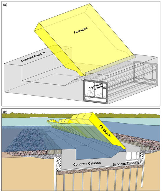 Scheme representing the characteristics of the concrete caissons and the yellow floodgates housed in them (a); the service tunnels for maintenance activities are also shown. The caissons were located on the seabed, longitudinally to the inlet of each barrier. The floodgates are raised during high tides and severe storm surges (b).