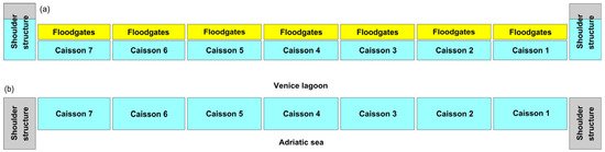Scheme representing a vertical section (a) and a plan (b) of the tunnels that connect the different concrete caissons. The caissons are submerged (in cyan); only the shoulder caissons are provided by emerged structures (in gray). The embedded floodgates are also represented (in yellow) (see also [42]).