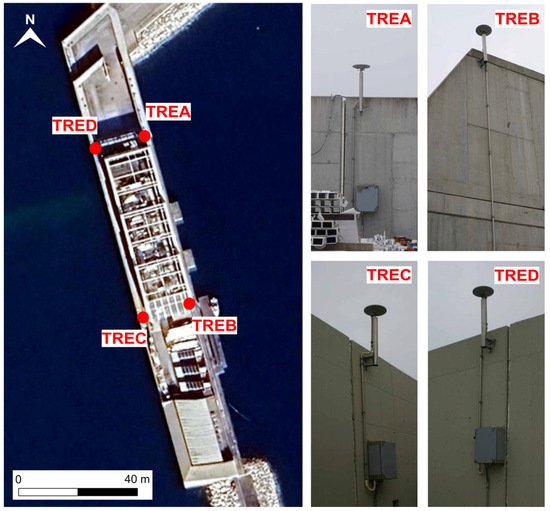 Detail A of Figure 4b. The location of the CGNSS stations, TREA, TREB, TREC, and TRED, at the corners of the east shoulder caisson in the Treporti barrier are shown, together with images representing the Trimble Zephyr 3 geodetic antennas fixed on the emerged structures.