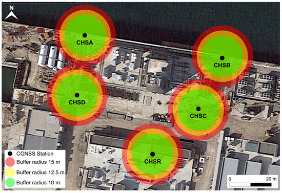 InSAR velocities were compared with the CGNSS data to calibrate and validate the EGMS and Veneto Region interferometry products in the area of the MOSE system, considering ground-based CGNSS measurements to be more reliable. In the first phase, the satellite data were compared with the VEN1 CGNSS velocity, the closest to the MOSE barriers and external to the construction sites. If a difference was found between the velocities of the InSAR points and the CGNSS values, the interferometric data were calibrated. In the comparison procedure, InSAR points enclosed in a circle centered on the GNSS station and with a radius of 15 m were selected; their mean velocity was compared, and then calibrated, with the GNSS velocity of the analyzed station projected along the satellite LOS. The other CGNSS stations of the external network were used to validate the new interferometric velocities obtained. This phase of calibration and validation did not involve the continuous stations of the MOSE system, as the anthropic works near the GNSS antennas could generate artificial velocities in the InSAR image processing, making them noncomparable with those measured by the GNSS antennas. In the second phase, the described comparison approach was applied to the 36 CGNSS stations of the MOSE. In detail, the mean velocities of InSAR points located on shoulder structures, enclosed in a buffer zone centered on the GNSS stations with radii of 15 m, 12.5 m, and 10 m, were calculated (Figure 9). These values, obtained before and after calibration, were compared with those of the CGNSS stations, using the GNSS–1 and GNSS–2 solutions projected on the LOS. The definition of the three different radii was established to evaluate the changes in velocities based on the distance of the PSs from the CGNSS station. The radii values were chosen as a compromise between the need to: (i) identify PSs for comparisons; (ii) obtain points near the corners of the shoulder structures; and (iii) minimize significant overlap between buffers, thereby preventing the same PSs from being used in velocity analysis for different corners.