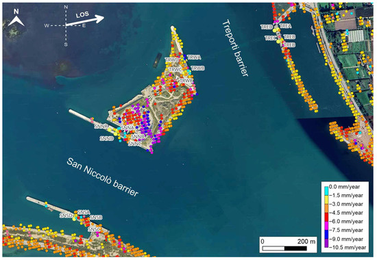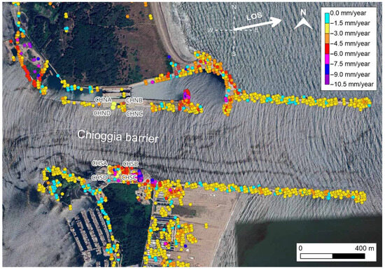Figure 10, Figure 11 and Figure 12, which show the velocities along the satellite LOS integrating the GNSS–1 solution with the InSAR EGMS dataset (track 44) for the MOSE construction sites and surrounding areas, highlight that the velocities obtained in this work confirm the general stability of the emerged structures, with most of the deformations gradually stabilizing. Furthermore, outside of the construction site areas, the velocities, in the order of 3–5 mm/year, agree with the values observed along the surrounding Venetian coast [37].