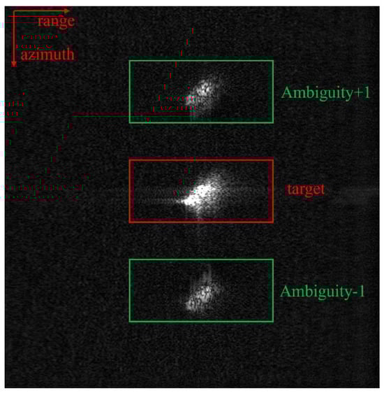 Figure 1 shows the imaging process and illustrates the division between the main region and the ambiguity region. In practice, undersampling in the azimuthal direction often results in ambiguous energy, leading to azimuthal ambiguity. Figure 2 shows a scene with azimuth ambiguity, where a real ship is present in the center region, while the upper and lower parts display artifacts of the ship caused by azimuth ambiguity, which do not actually exist. To address this issue, we introduce group sparsity.