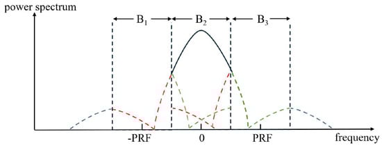 During sparse SAR imaging, the portion of the Doppler spectrum that exceeds the PRF is folded into the azimuth processing bandwidth, causing it to mix with the main signal and resulting in azimuth ambiguity. As shown in Figure 3, the green and red dotted lines illustrate how the ambiguity areas fold into the main area. That is to say that the finite number of samples in the azimuth direction leads to spectral aliasing in the azimuth direction, resulting in azimuth ambiguity. The structure of the SAR imaging operator in the ambiguous regions closely resembles that in the main area, except the azimuth frequency. This means we can use different scattering coefficients to represent signals from different parts. If each set of data is considered as echo data from different angles, then the entire signal model can be expressed as follows: