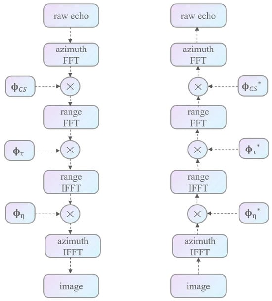 where  represents the FFT operation in the azimuth direction,  represents the FFT operation in the range direction,  represents the IFFT operation in the azimuth direction, and  represents the IFFT operation in the range direction.  represents the range cell migration correction (RCMC) phase term,  represents the range compression phase term, and  represents the azimuth–range decoupling phase term. Matrices marked with asterisks represent their inverse matrices.