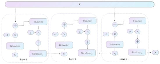 It is obvious that the two parameters, step size  and threshold , need to be manually adjusted, and the results of these parameters have a great impact on the experimental results. Therefore, it is considered to utilize the design of a network structure to train these two parameters [], which ensures that these two parameters are unified in each layer and are adaptively trained between different layers of the network. Because of the use of ISTA, we call this network ISTA-Net. The structure of ISTA-Net is shown in Figure 5.