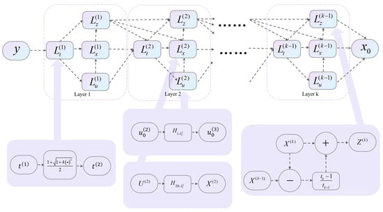 Similar to the basic network, we can use a deep unfolded network to train these parameters. The structure of the unfolded network is shown in Figure 6. We call this network the Azimuth Ambiguity Suppression Network (AAS-Net). For ease of representation, we divide the entire network structure into four modules, , , , and , which are used to update the parameter t, the principal view , the gradient , and the intermediate variable .