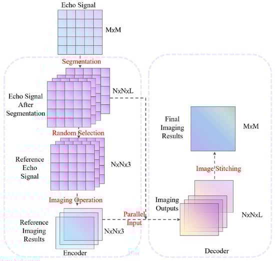 As shown in Figure 7, we design an encoder–decoder network to enable the self-supervised operation of the entire unfolding network. In the encoder, the raw echo signal is partitioned into L smaller echoes. Three of these raw echoes are randomly selected to generate the corresponding reference imaging results, which serve as labels for training the network. The network model is trained using these three sets of reference echoes and their corresponding reference imaging results. In the decoder, the partitioned raw echo signals are processed through the encoder-trained network model to obtain small-area imaging results for each chunk. These imaging results are then stitched together to form the complete large-area imaging output from the decoder. It is noteworthy that within the decoder section, a branch connection is incorporated. This connection directly feeds the echo signal from the encoder input segment into the decoder input, ensuring the seamless progression of the imaging process.