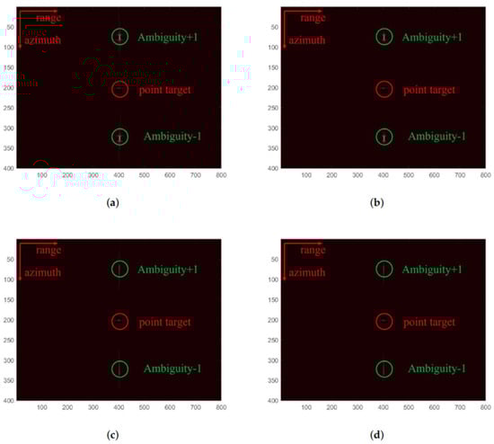 We designed a point-target simulation experiment to test the effectiveness of the network proposed in this paper in terms of orientation ambiguity suppression. Table 1 shows the necessary radar imaging parameters for the simulation experiment, where there is 60% undersampling in the azimuth direction. We used the CS-IST algorithm, CS-IST-AAS algorithm, ISTA-Net, and SAAS-Net for point target imaging. The imaging results are shown in Figure 8.