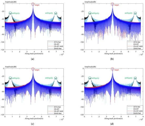 To better show the imaging effectiveness of the algorithms, we located the point of maximum value and conducted interpolation 16 times. The interpolated azimuthal slice is shown in Figure 9. This indicates that both the CS-IST-AAS algorithm and SAAS-Net can significantly reduce the side-lobes. In the results of CS-IST and ISTA-Net, there are two side peaks on the left and right sides of the main peak, which is known as azimuth ambiguity. This occurs due to an insufficient sampling rate in the azimuth direction, causing part of the main observation area’s spectrum to fold into the ambiguous region, thereby creating ambiguous energy. In the azimuth spectrum, this will appear as two symmetric peaks.