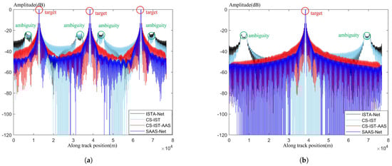 To further demonstrate the effectiveness of the method, imaging experiments with multiple point targets were designed. In Figure 10a, sparse imaging of three point targets uniformly distributed in the azimuth direction was performed, while in Figure 10b, sparse imaging of three point targets uniformly distributed in the range direction was carried out. It can be observed that, whether in the azimuth or range direction, SAAS-Net performs well in suppressing azimuthal ambiguity. Meanwhile, although the imaging effect of CS-IST-AAS is similar to that of SAAS-Net in single point target imaging experiments, in the imaging process of multiple point targets, SAAS-Net exhibits a significantly stronger suppression effect on side-lobes compared to CS-IST-AAS.