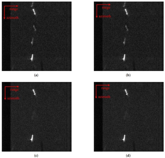 In the imaging results, the longitudinal direction is the azimuthal direction, and the transverse direction is the range direction. In contrast, the ISTA-Net algorithm in Figure 8b can weaken the azimuth ambiguity to a certain degree. The ambiguity phenomenon is eliminated in Figure 8c,d. Comparing Figure 8a to Figure 8b, since Figure 8b uses a deep unfolding network with the theoretically optimal parameters, the imaging result is better than in Figure 8a, which completely relies on manual parameter tuning. Similarly, the imaging result of Figure 8d is slightly better than Figure 8c. At the same time, the algorithms in Figure 8c,d add structural sparsity constraints, and from the perspective of the signal model and the causes of azimuth ambiguity, they suppress azimuth ambiguity. Therefore, compared to the algorithms in Figure 8a,b, they show a significant suppression effect on azimuth ambiguity.