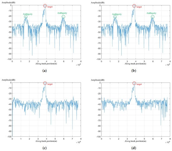 We sliced the azimuthal direction of the real data. It can be seen in Figure 12 that the azimuthal side-lobes were significantly reduced in the algorithm of this paper and CS-IST-AAS, and the other two algorithms had significant ambiguity energy in the azimuthal direction.