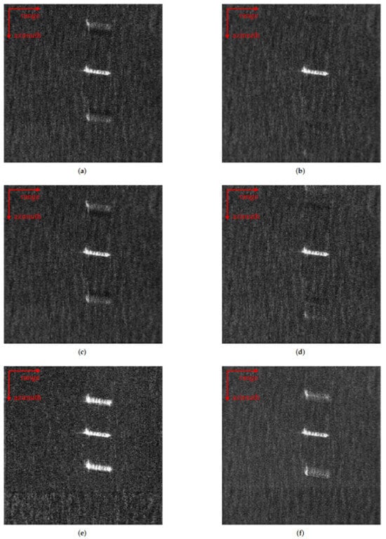 Imaging results after azimuth undersampling: (a) result of ISTA-Net with 80% azimuth undersampling; (b) result of AAS-Net with 80% azimuth undersampling; (c) result of ISTA-Net with 60% azimuth undersampling; (d) result of AAS-Net with 60% azimuth undersampling; (e) result of ISTA-Net with 30% azimuth undersampling; (f) result of AAS-Net with 30% azimuth undersampling.