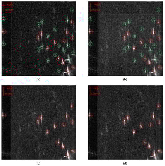 Real data imaging results: (a) sparse imaging algorithm based on chirp-scaling; (b) unfolded network based on the chirp-scaling imaging algorithm; (c) traditional azimuth ambiguity suppression algorithm based on group sparsity; (d) SAAS-Net.