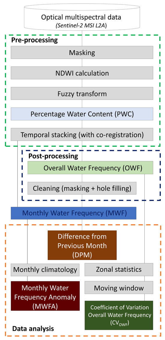 Data processing flowchart showing the main steps followed to analyze Sentinel-2 MSI data for detecting anomalies in water frequency.