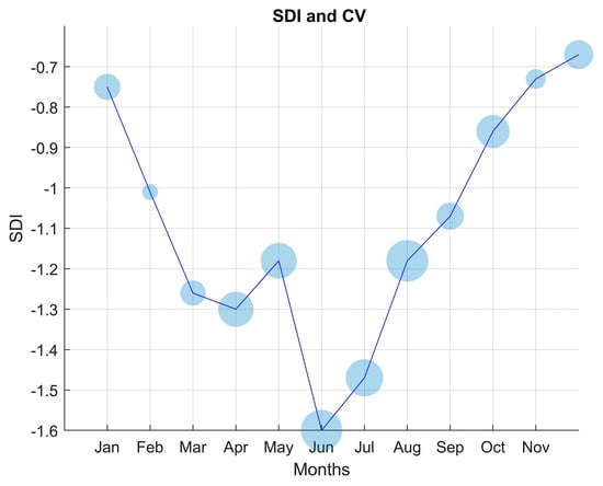 Monthly SDI and CV (the latter represented by bubble size) calculated for Po River discharge at the Pontelagoscuro hydrological station for the year 2022. See Table 1 for SDI values classification (drought).