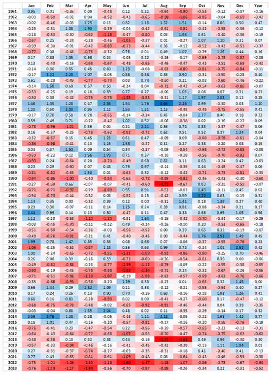Streamflow Drought Index (SDI) values calculated for the Po River discharge in the period 1961–2023. Discharge data refer to the Pontelagoscuro hydrometer (see Figure 1). The blue gradient colors represent positive SDI values; the red gradient colors represent negative SDI values.