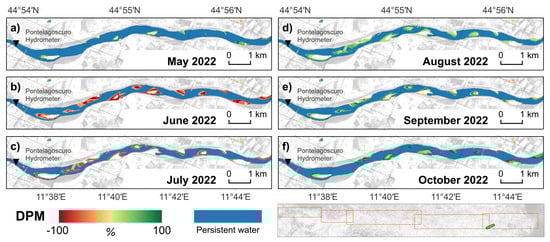 Pontelagoscuro focus area (green rectangle in the overview map). Difference from the previous month (DPM) during the period May 2022–October 2022. (a) May 2022. (b) June 2022. (c) July 2022. (d) August 2022. (e) September 2022. (f) October 2022.