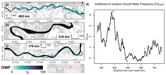 Spatial distribution of OWF for the three selected focus areas (green rectangles in the overview map, with corresponding sub-figure letter). (a) Braided patterns. (b) Partially confined channel forms. (c) Longitudinal lateral bars. (d) Coefficient of variation in monthly water frequency (CVOWF, 10 km moving average) over the river course.