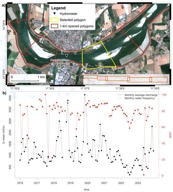 (a) Subdivision of the Po river area, in Pontelagoscuro (green rectangle in the overview map), into slices (polygons in red color) of 1 km length: the location of the reference hydrometer is indicated by a black triangle, while the selected polygon for the analysis of monthly water frequencies is highlighted in yellow color. (b) The trend of monthly average discharge measured by the Pontelagoscuro hydrometer and the trend of monthly water frequency (MWF) calculated for the selected area over the period 2016–2023.