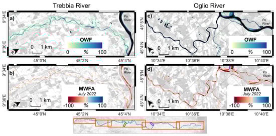 (a) Overall water frequency (OWF) of Trebbia River tributary. (b) Monthly water frequency anomaly (MWFA) during July 2022 of Trebbia River tributary. (c) Overall water frequency (OWF) of Oglio River tributary. (d) Monthly water frequency anomaly (MWFA) during July 2022 of Oglio River tributary.