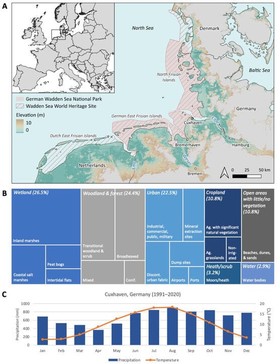(A) Site overview of German North Sea coast. (B) Land cover of the 17 counties and independent cities along the German North Sea coast. Land cover types representing less than 1% of the total area were excluded from this figure. (C) Precipitation and temperature by month at the Cuxhaven, Germany weather station as an example of precipitation and temperature patterns on the German North Sea coast.