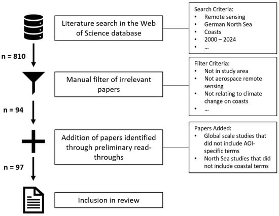 We conducted a literature search in Web of Science (WoS) using the advanced search function. SCOPUS was also considered for use but was found to yield no additional relevant publications compared to the WoS results. Therefore, Web of Science was selected for its user interface. We composed a search string with Boolean operators that focused primarily on three elements: field of study (remote sensing), study area (German North Sea coast), and coastal features (e.g., coast, shoreline, etc.). The first operator aimed to capture any studies that use remote sensing, with a focus on satellite, aircraft, or UAV sensors. The study area element included names of geographic areas of varying scales (e.g., North Sea, Wadden Sea, Sylt) so that studies with small and large study areas alike would be captured. As this review also included tidally influenced river areas, this element included upstream search terms such as Hamburg, Bremen, and Elbe. The coastal morphology element included uniquely coastal physical features and aimed to identify studies that focused specifically on the coast. We implemented this third element because our preliminary search strings yielded many studies that took place at or near the German North Sea coast but did not have to do with coastal dynamics (e.g., lakes in Northern Germany) or studies that dealt primarily with oceanography or phenomena away from the coasts (e.g., offshore wind).