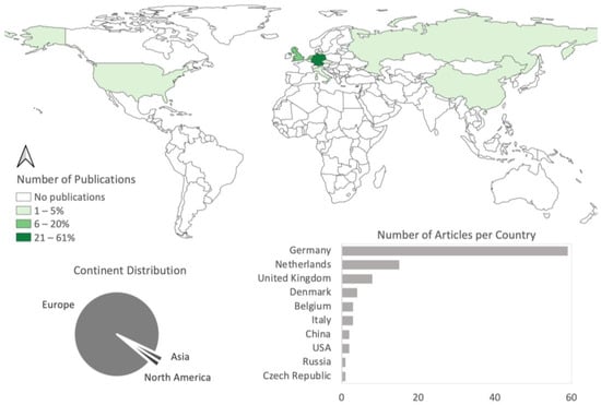 Authorship in this topic was found to be highly localized (Figure 4). First, authors were predominantly affiliated with institutes located in Europe, with Germany publishing far more papers than any other nation (59). This was followed by the Netherlands (15) and the United Kingdom (8). The only first author-affiliated nations in Asia and North America were China (two) and the United States (two), respectively. All in all, the countries sharing the North Sea coast were affiliated with the majority (89 studies, or 92%) of papers.