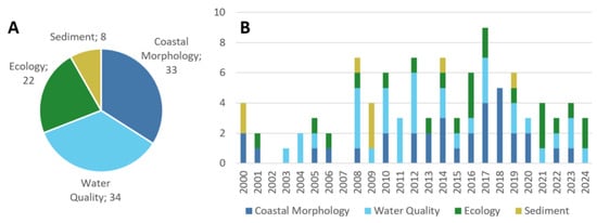 However, temporal resolution differed substantially by category. Multitemporal and multiannual studies made up most water quality studies (76%), while they made up less than half of coastal morphology, ecology, and sediment studies (42%, 41%, 38%, respectively). Out of all categories, multiannual studies were most prevalent in coastal morphology studies (33%) and in ecology studies (21%), but much less common in water quality studies (3%), and did not occur in sediment studies.