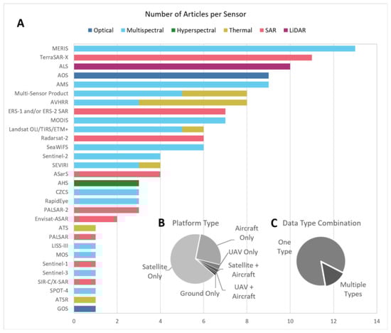 (A) Overview of remote sensing platforms, sensors, and data types used in reviewed articles. Instances in which sensors or data types used were unclear are excluded. Abbreviations: AHS—airborne hyperspectral sensor, ALS—airborne laser scanning, ALOS, AMS—airborne multispectral sensor, ASarS—airborne SAR sensor, ATS—airborne thermal sensor, AVHRR—advanced very-high-resolution radiometer, CZCS—coastal zone color scanner, ERS—European Remote Sensing Satellite, LISS—linear imaging self-scanning sensor, MERIS—medium-resolution imaging spectrometer, MODIS—moderate-resolution imaging spectroradiometer, MOS—Marine Observation Satellite, PALSAR—Phased Array L-band SAR, SEVIRI—Spinning Enhanced Visible Infrared Imager, SIR-C/X-SAR—spaceborne imaging radar-C/X-band SAR, SPOT—Satellite Pour l’Observation de la Terre, ATSR—along track scanning radiometer. “None” refers to crewed airborne vehicles that collected visual aerial surveys. (B) Platform types used by papers (C) Data type combinations in reviewed papers.