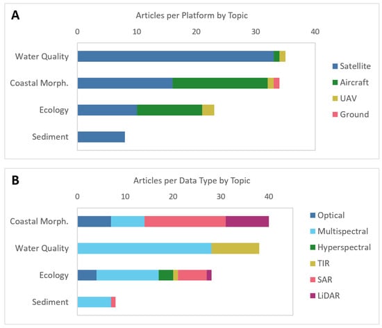 The platforms and data types used varied by article topic (Figure 7). Water quality and sediment studies predominantly used satellite sensors data (Figure 7A). Coastal morphology and ecology, however, used a wider variety of platforms. Coastal morphology studies used every platform type considered in this paper, while ecology studies used all except ground-based remote sensing. Satellite sensors are used across all topics, while UAVs were used very little in comparison across all topics. Sediment studies used the least variety of platforms overall, applying only satellite observations.