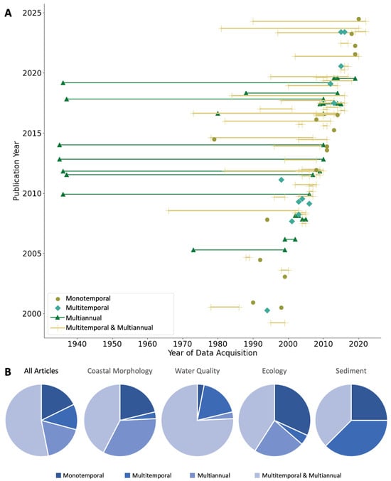 We classified papers according to temporal resolution and study period (Figure 8). Monotemporal studies used a single acquisition for their study. Studies with multitemporal resolution used more than one acquisition within one year, whereas multiannual resolution studies used a single acquisition every year for two or more years. Multitemporal and multiannual studies used more than one acquisition per year for more than two years. Nearly half (49%) of all papers reviewed were multitemporal and multiannual (Figure 8B) and the remainder were fairly evenly split between monotemporal, multitemporal, and multiannual resolution. The study periods of multiannual studies were generally longer than the study periods of multitemporal and multiannual studies, offering lower temporal resolution (generally less than one image per year) but providing insights into long-term coastal patterns (Figure 8A). Some studies were able to extract data from before the 1970s and the launch of the first publicly available satellite data using airborne RS. The majority of multitemporal and multiannual studies appear to focus on the period from 2000–2024, with many studying two- to five-year time periods.