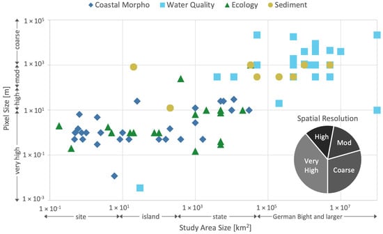 Topics were clustered along the spectrum of spatial scales and resolutions. Coastal morphology and ecology studies generally used small pixel sizes over small spatial scales compared to water quality sediment studies, which generally used larger pixel sizes over large spatial scales. Water quality studies generally used the lowest resolution data compared to all other papers and covered the largest study areas compared to all other studies. One exception is Fricke et al. [] which used aircraft- and UAV-collected RS data to assess SST in the Elbe. In general, lower spatial resolution studies used satellite-borne sensors, while higher spatial resolution studies used airborne and UAV sensors. Data types were also associated with spatial resolution: SAR and LiDAR, on average, offered higher resolution than optical or multispectral data.