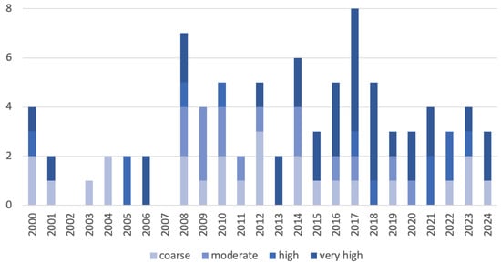 Spatial resolution varies by topic as well as by publication year. Figure 10 displays the distribution of studies by spatial resolution over time. While moderate- and high-resolution studies slightly increase over time, the number of coarse resolution studies decreases over time. Further, studies using very-high-resolution imagery notably increase over time. From 2000 to 2012, most studies used coarse or moderate resolution imagery. In contrast, papers published since 2013 used predominantly high- and very-high-spatial resolution imagery.