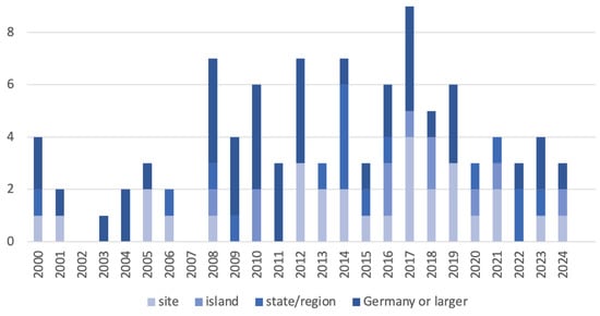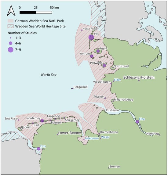 Forty-one papers, mostly on water quality, considered the entire German North Sea coast or larger as its study area. Approximately a third of papers considered site-scale study areas, 16% considered state or regional scales, and just over 10% considered island scales. Of the 56 papers that considered sub-national areas, study areas occurred throughout the North Sea coast of Germany (Figure 11). Studies occurred on all barrier islands of the German North Sea except Wangerooge, although some islands were more frequently studied. Of the islands, Sylt was by far the most frequently studied, followed by Norderney, Foehr, Amrum, and Pellworm. Compared to studies on individual islands, few studies occurred at the scale of an entire state or of the entire coast—only three studies focused on Schleswig-Holstein, and two focused on Lower Saxony (Niedersachsen). Overall, the most frequent study areas were the Elbe and Sylt. No studies focused on the Halligen, the low-lying un-diked islands occurring in northern Schleswig-Holstein, mostly between and south of the larger islands of Foehr, Amrum, and Pellworm [].