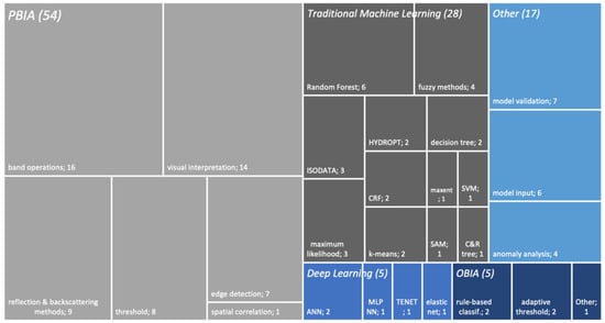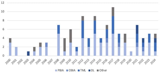 We also analyzed the temporal distribution of methods (Figure 14). PBIA methods are dominant until approximately 2017, with an increase in OBIA and TML methods from about 2018 onward. DL is mostly applied in papers published since 2021, with the notable exception of a publication in 2003 [].