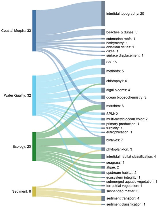 We further divided the four overarching topics by sub-topics, determined by the feature or phenomenon that a publication used remote sensing to examine (Figure 15). Some studies that share sub-topics are categorized into different overarching topics based on the goal or aim of the paper. For example, multiple papers evaluated marshes, but some did this with the aim of understanding coastal morphology, while others aimed to answer questions about ecological function.