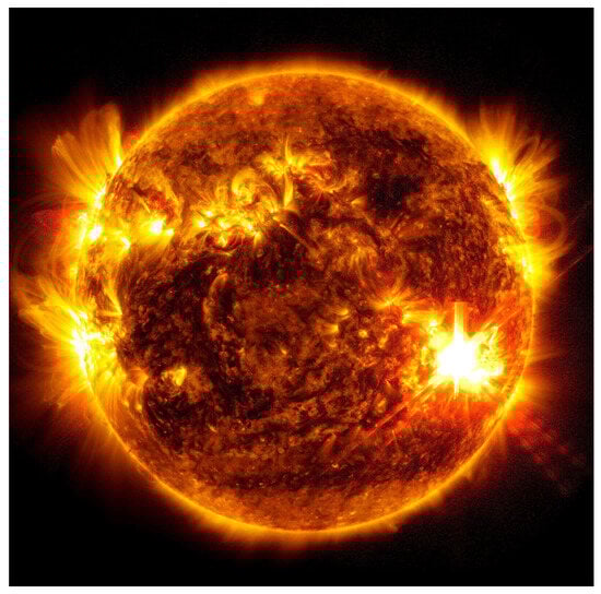 A solar flare is a sudden burst in magnetic flux emanating from the Sun’s surface within the solar corona and heliosphere. In accordance with peak soft X-Ray flux in the 1–8 Å wavelength range, flares can be logarithmically categorized as A, B, C, M, and X, with increasing intensities where M and X category flares correspond to the most intense flare categories [1]. These major solar events, as in Figure 1, can produce emissions such as Gamma Ray, X-Ray, and Extreme Ultraviolet (EUV). As a result, astronauts operating in space stations can face radiation-based health risks, electronic devices such as GPS and radio may fail to function, and serious infrastructure problems may occur [2,3]. Furthermore, the infamous 1859 Carrington Event shows that a similar massive solar superstorm hitting our contemporary technology-reliant society could lead to a prolonged nationwide blackout in the United States, lasting for months. The aftermath is projected to inflict economic havoc, with anticipated damages reaching USD trillions [4]. Currently, there is no well-established theoretical connection between the influx of magnetic fields and the occurrence of extreme events in solar active regions. Accordingly, in the heliophysics community, this draws emphasis on detailed data analysis and investigation of different methodologies to obtain robust flare prediction performance from magnetic field state data of solar active regions, with sensor observations from space-based and ground-based instruments playing a crucial role in data collection.