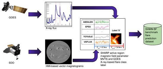 Various studies aimed to utilize machine learning for the task of solar flare prediction; however, they were using point-in-time measurements [3]. As a result, it becomes difficult to ascertain whether variations in accuracy or skill score values across these studies stem from the inherent stochasticity in flare occurrence, the preprocessing and sampling approaches employed, or the execution of machine learning models [1]. The SWAN-SF dataset [5] was created to address the issues, being composed of MVTS, to enable impartial flare forecasting and contribute to significant advancements in forecasting that go beyond incremental improvements. SWAN-SF primarily relies on sensor data obtained from NASA’s SDO, specifically the SHARPs from the Joint Science Operations Center (JSOC). These patches are derived from solar vector magnetograms captured by the HMI instrument that functions as a sensor onboard SDO, continuously observing the Sun and providing detailed magnetic field data from the solar photosphere. However, the SHARPs do not contain flare information, which is instead sourced from the Geostationary Operational Environmental Satellites (GOES) operated by NOAA. GOES, equipped with X-ray and particle detectors, has been detecting solar flares since 1975 and provides a catalog of flare events, including key details like flare time, classification, and spatial location on the solar disk, thereby providing the labeling information. The dataset creation process involves three key steps. First, solar flare reports from GOES are cleaned to resolve conflicting information. Second, these flare reports are matched with solar magnetic data from the HMI, either through matching NOAA AR numbers with HARP numbers in SHARPs or using a spatiotemporal overlap procedure to align flare occurrences with HMI active region patches. Lastly, sampling biases are eliminated to ensure a balanced and accurate dataset for training machine learning models [6]. Figure 2 illustrates the data pipeline.