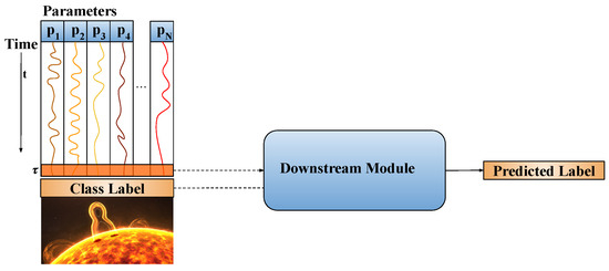 Inspired by the work presented in [3], we represent vector magnetogram data by utilizing only the last timestamp of the MVTS instances for all magnetic field parameters. The reason for this choice is that the last timestamp is temporally closest to the flaring event. Parallel to this, for each MVTS instance , we extract a one-dimensional feature vector . After obtaining this representation vector for each MVTS instance, denoted as where K is the total number of MVTS instances, we use as input to train the downstream module in a supervised manner to provide the class prediction. Figure 4 gives an insight into the process of solar flare prediction using VLT representation.