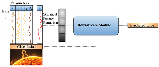 Inspired by the work presented in [1], we extract a limited set of descriptive statistics from each univariate time series within the MVTS instances, specifically the median, mean, standard deviation, skewness, and kurtosis. Unlike the original work, we also incorporate the point-in-time last-value feature in a manner similar to the VLT approach to have greater representation capabilities. For each MVTS instance , we extract a feature vector by taking the mentioned six descriptive parameters. After obtaining this representation vector for each MVTS instance, denoted as with K representing the total number of MVTS instances, we use as input to train the downstream module in a supervised setting. Figure 5 gives an insight into the process of solar flare prediction using VSTAT representation.