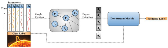 After obtaining graphs from each MVTS instance as and , we vectorize the graph instances by extracting the degree information of nodes in the graph. The degree of a node can be described as the number of connections that the particular node forms with other nodes in the graph. Each graph instance yields a degree vector of containing the degrees of each node in the graph to compactly describe the graph structure. In this respect, for all graph instances in the training set, we obtain the degree matrix, , with K being the number of graphs. We use this information as input in the training stage for the downstream module. Figure 7 gives an insight into the process of solar flare prediction using degree representation.