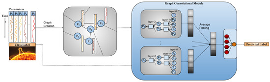 An overview of the graph-based solar flare prediction process is presented, wherein each MVTS instance is transformed into a graph consisting of nodes that represent magnetic field parameters, with their corresponding univariate time series serving as node features. Subsequently, each graph is processed through our graph convolutional module.