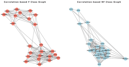 A view of the structure of randomly selected opposite-class correlation graphs created from Pearson correlation matrices, which illustrate the inter-parameter connections. The nodes have a one-to-one correspondence with the magnetic field parameters from Table 1. The F graph represents an X2.2 flare observed in NOAA active region 377, spanning 14 February 2011 from 02:00 to 13:48 UTC. The NF graph corresponds to an FQ event in NOAA active region 1038, with a timestamp from 9 November 2011 at 20:12 UTC to 10 November 2011 at 08:00 UTC.