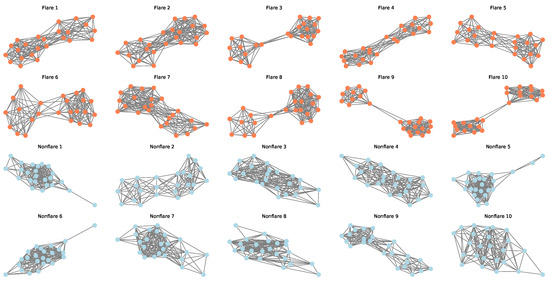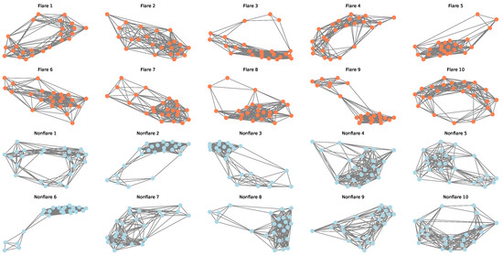 Here, we analyze the Pearson correlation and Euclidean distance graphs to explore the relationships among univariate time series instances, each representing solar magnetic field parameters. For the created Pearson correlation graphs, Figure 10 displays the inter-parameter connections to provide a focused view into the structures of graph classes. Our first observation is that the F and NF graphs express different connections for magnetic field parameters as expected. For example, in the selected F-class graph, the TOTZ parameter forms significantly more connections, resulting in a higher node degree compared to the selected NF-class graph, where the TOTZ parameter has relatively fewer connections with other magnetic field parameters, leading to a lower node degree. Figure 11 shows various randomly selected graphs to provide an overview.